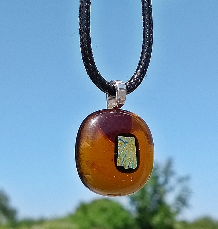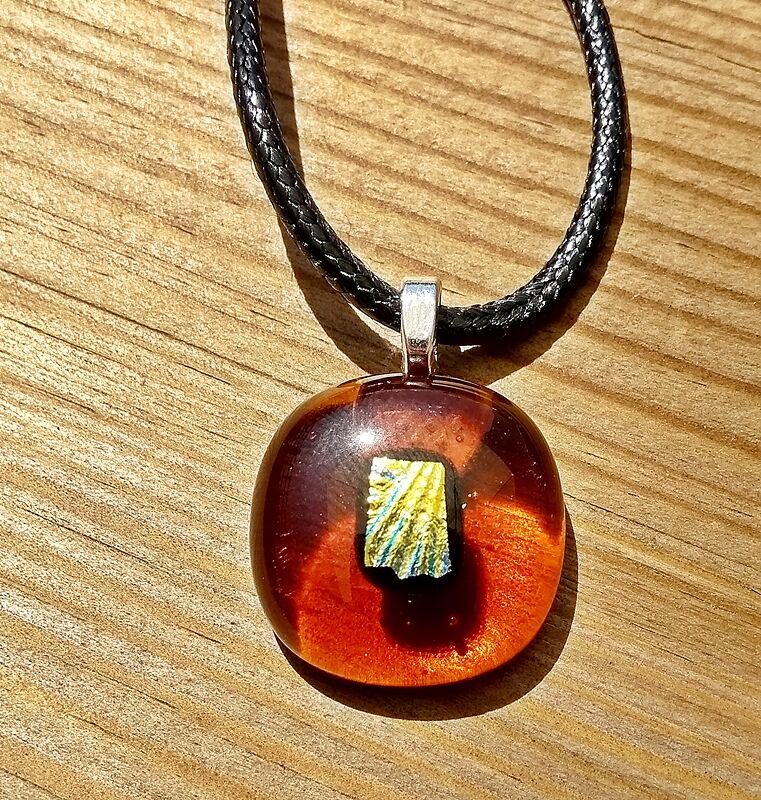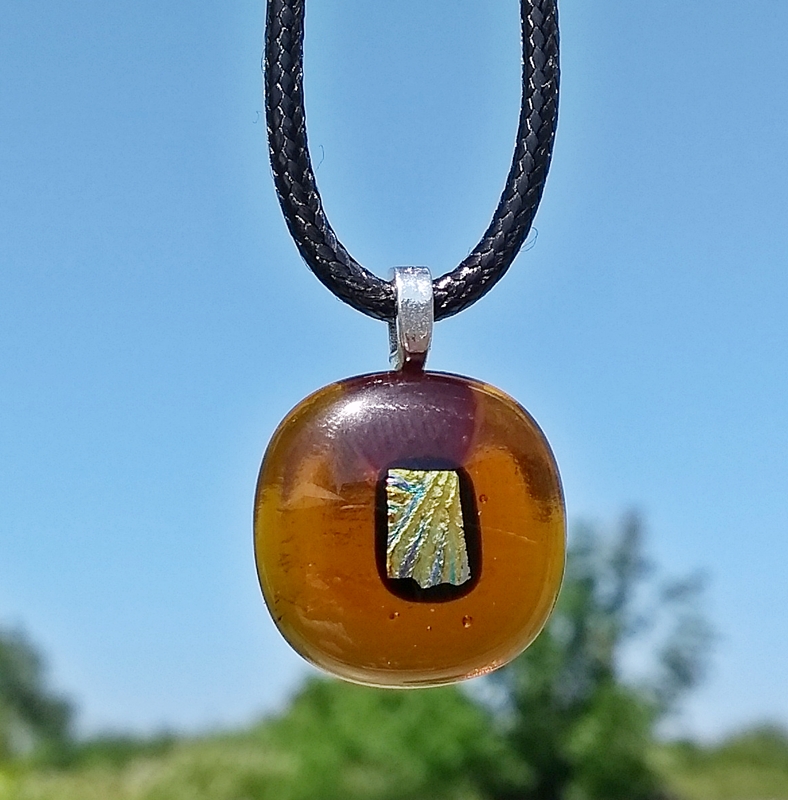 A beautiful rich amber colour glass with central gold dichroic sparkle in the centre.